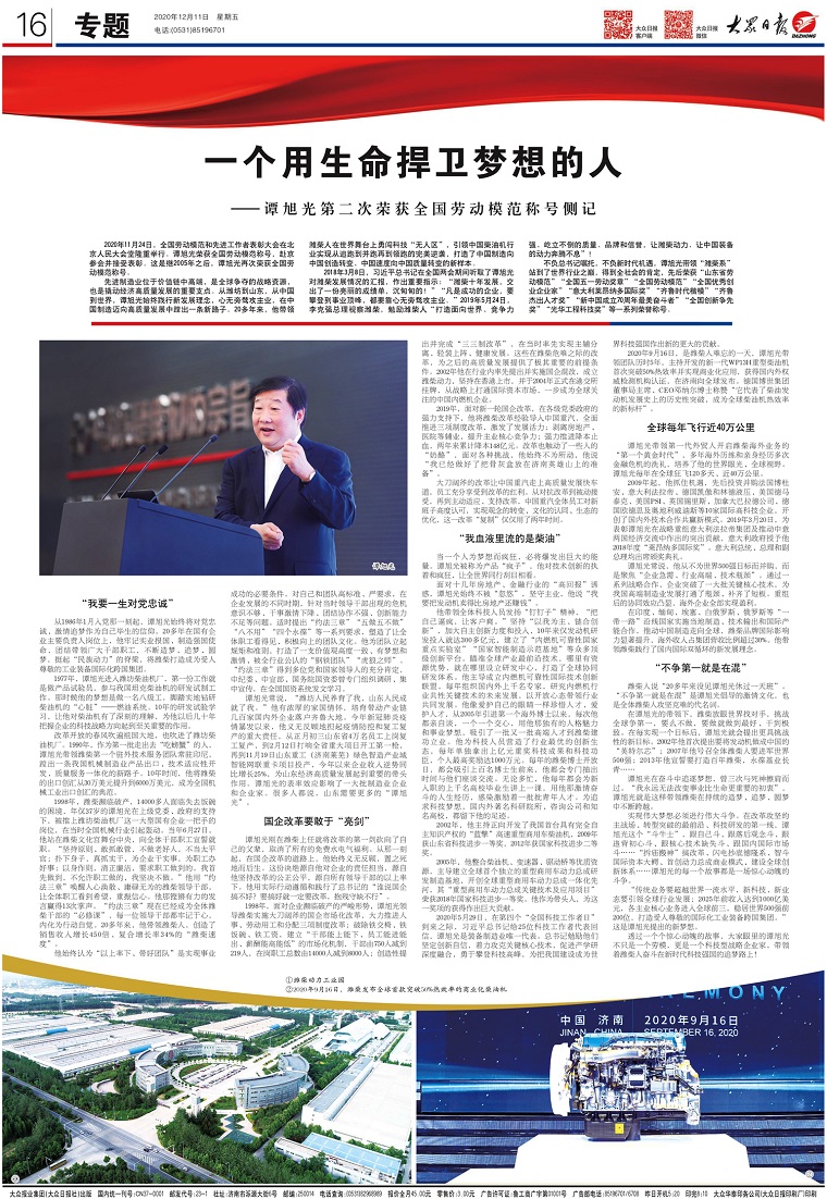 從1986年1月入黨那一刻起,譚旭光始終將對黨忠誠、激情追夢作為自己畢生的信仰。20多年在國有企業主要負責人崗位上,他牢記實業報國、制造強國使命,團結帶領廣大干部職工,不斷造夢、追夢、圓夢,挺起“民族動力”的脊梁,將濰柴打造成為受人尊敬的工業裝備國際化跨國集團。